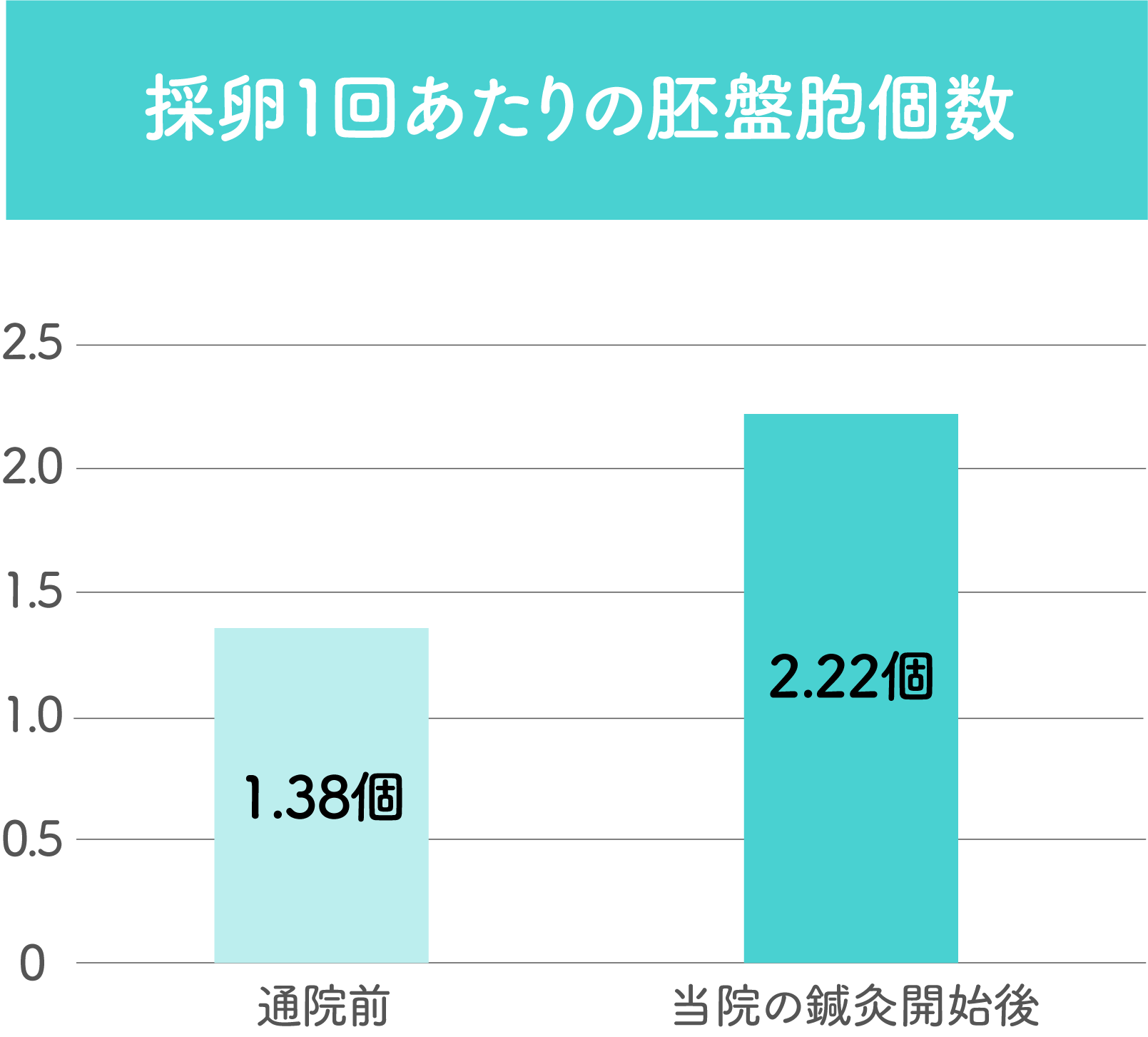 元々の胚盤胞個数が少なく難しい状況の患者さまとなりますが、通院前後で比較すると胚盤胞に到達する個数が1.6倍に増加しています。